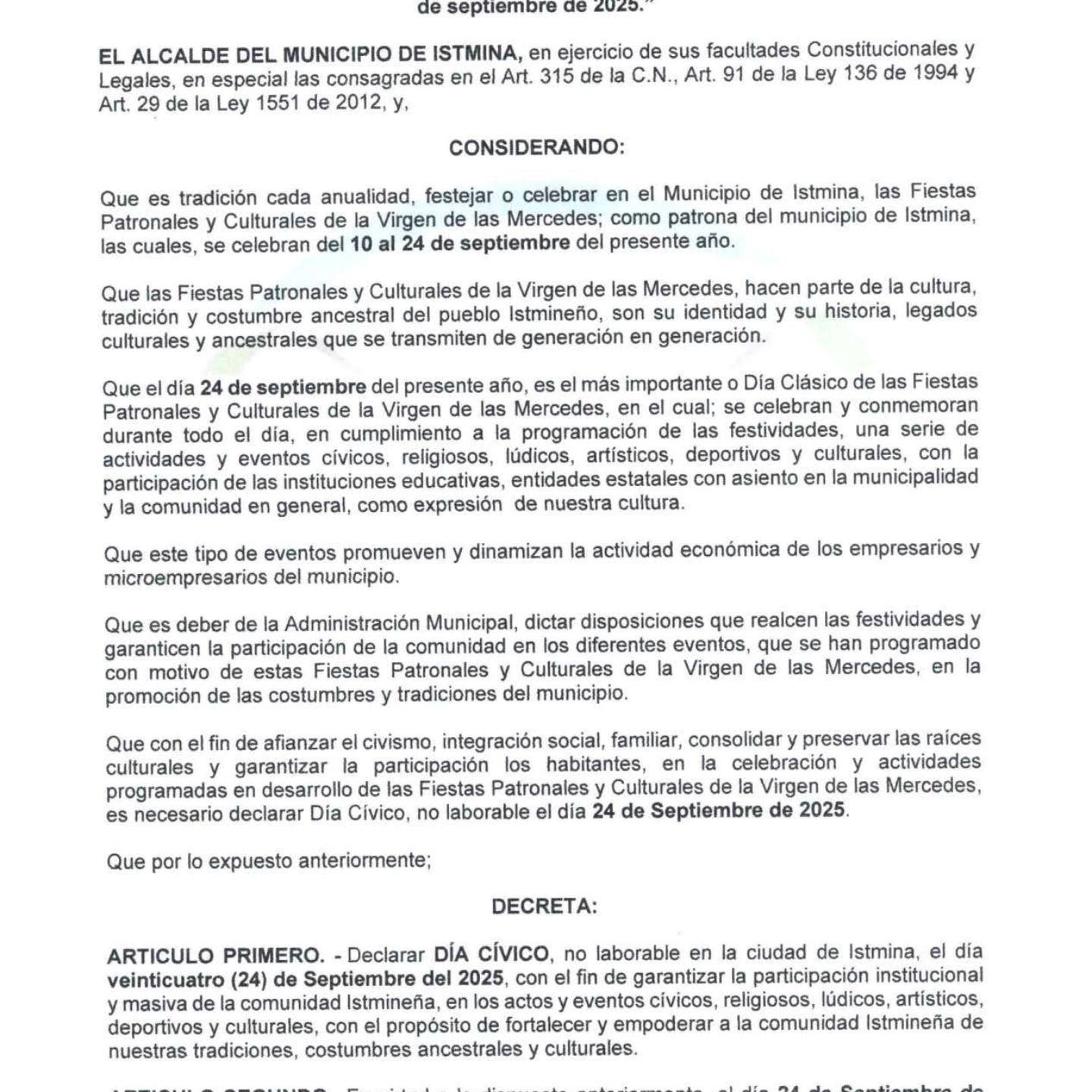 El alcalde Jaison Mosquera Sánchez anunció que el próximo 24 de septiembre será día cívico para los istmineños, en honor a las festividades de la Virgen de las Mercedes, cuya…