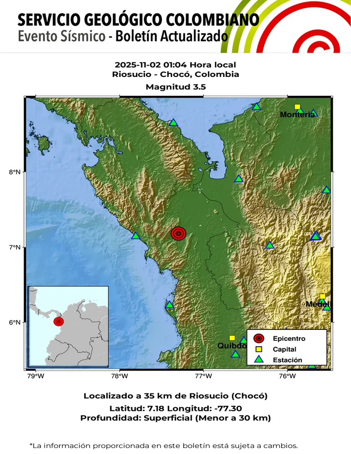 SERVICIO GEOLÓGICO REPORTÓ SISMO LEVE EN RIOSUCIO, CHOCÓ; NO HUBO DAÑOS MATERIALES