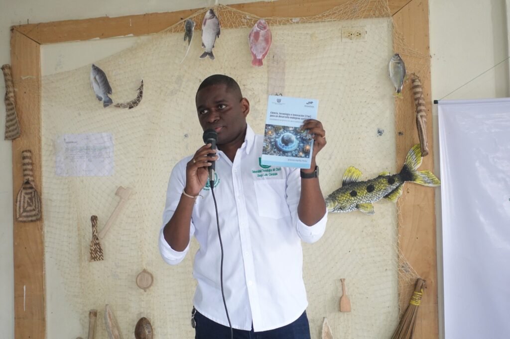 En la primera sección, se realizó un conversatorio que buscaba integrar el conocimiento científico empírico y el académico. Para ello, se contó con la participación de cinco invitados especiales. Dos agricultores locales, uno de etnia indígena y otro afrocolombiano, compartieron sus técnicas tradicionales de cultivo, sus conocimientos ancestrales sobre el manejo sostenible de los recursos naturales y los desafíos que enfrentan en la agricultura de la región. Estas intervenciones fascinaron a los estudiantes, quienes pudieron apreciar la sabiduría y el ingenio de sus propias comunidades. Posteriormente, tres docentes de la Universidad Tecnológica del Chocó, con títulos de PhD y maestrías, resaltaron la importancia de la conservación ambiental y cómo la ciencia puede transformar positivamente las comunidades rurales. Hablaron sobre iniciativas de investigación que han tenido un impacto significativo en el mejoramiento de las prácticas agrícolas, la adopción de energías renovables y la protección de los ecosistemas locales. Los estudiantes quedaron impresionados por la forma en que la academia puede vincularse con las necesidades reales de su entorno.
