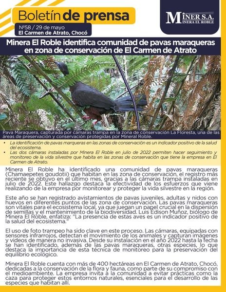 Minera El Roble ha hecho un descubrimiento notable en sus zonas de conservación en El Carmen de Atrato: la identificación de una comunidad de pavas maraqueras (Chamaepetes goudotii). Este hallazgo, registrado en el último mes gracias a las cámaras trampa instaladas en julio de 2022, resalta los esfuerzos de la empresa por monitorear y proteger la vida silvestre en la región.
