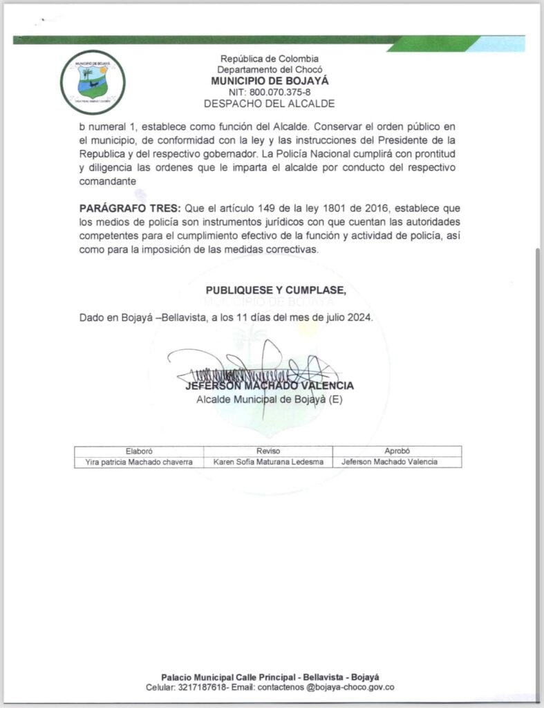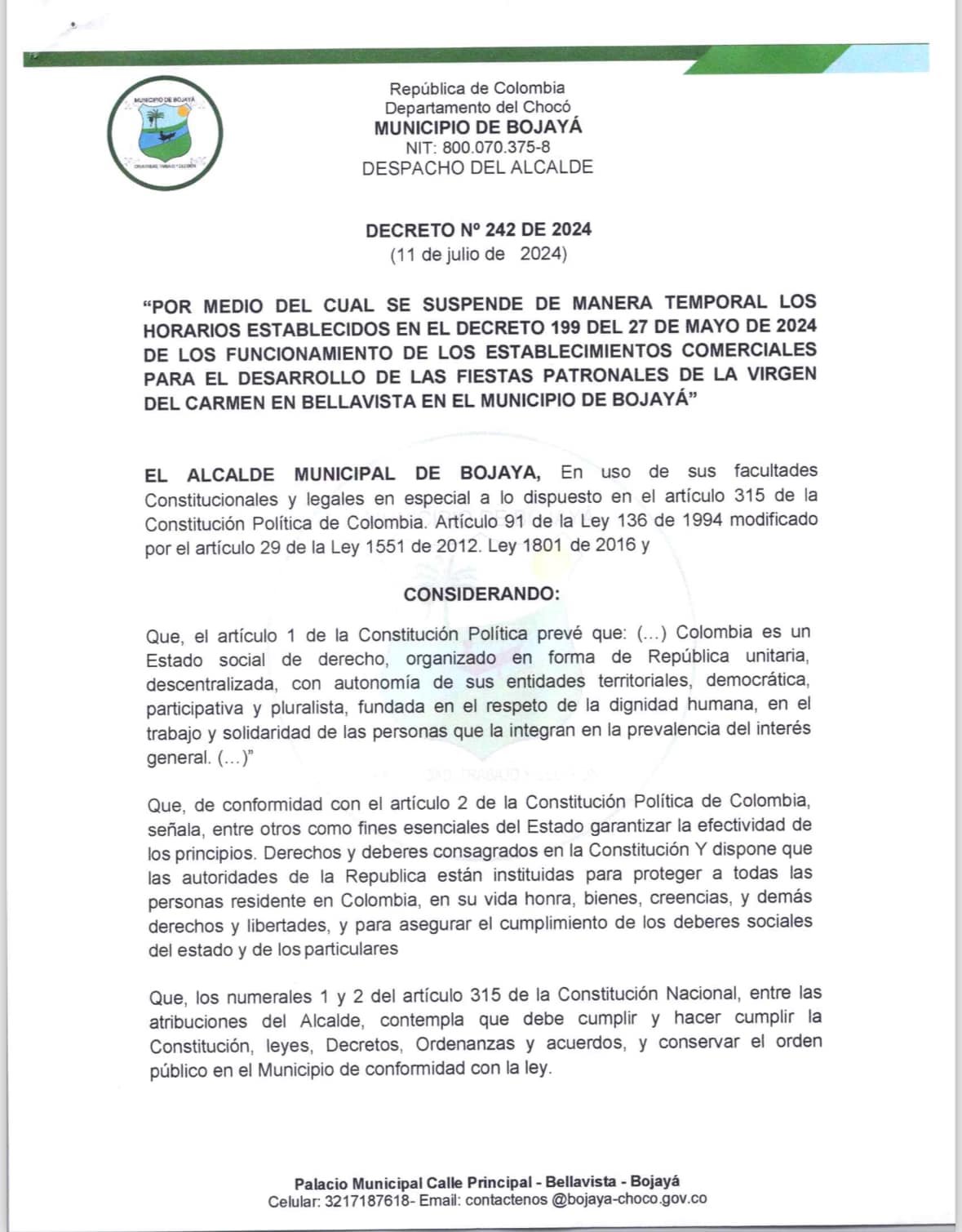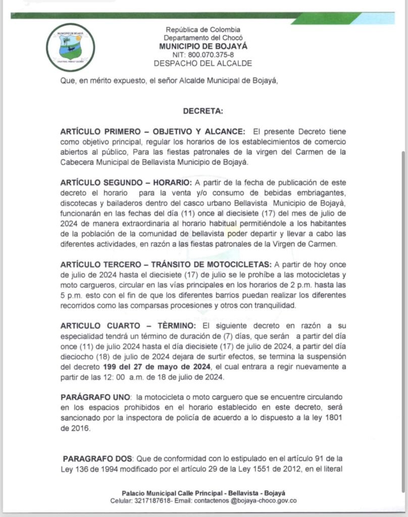 El Municipio de Bojayá se prepara para celebrar las Fiestas Patronales de la Virgen del Carmen en Bellavista con una medida especial anunciada hoy. A través del Decreto N° 242 de 2024, emitido el 11 de julio, se ha dispuesto la suspensión temporal de los horarios establecidos en el Decreto 199 del 27 de mayo de 2024 para el funcionamiento de establecimientos comerciales.