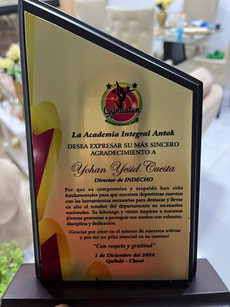 La Academia Integral Antok desea expresar su más sincero agradecimiento a Yohan Yesid Cuesta Cuesta, director de Indecho, por su valioso compromiso y respaldo hacia el desarrollo del deporte en el Chocó. Gracias a su apoyo, nuestros atletas han podido acceder a las herramientas necesarias para destacar en competencias nacionales, llevando con orgullo el nombre del departamento. Su liderazgo ha sido clave en el impulso de los jóvenes deportistas que buscan brillar en el ámbito nacional.