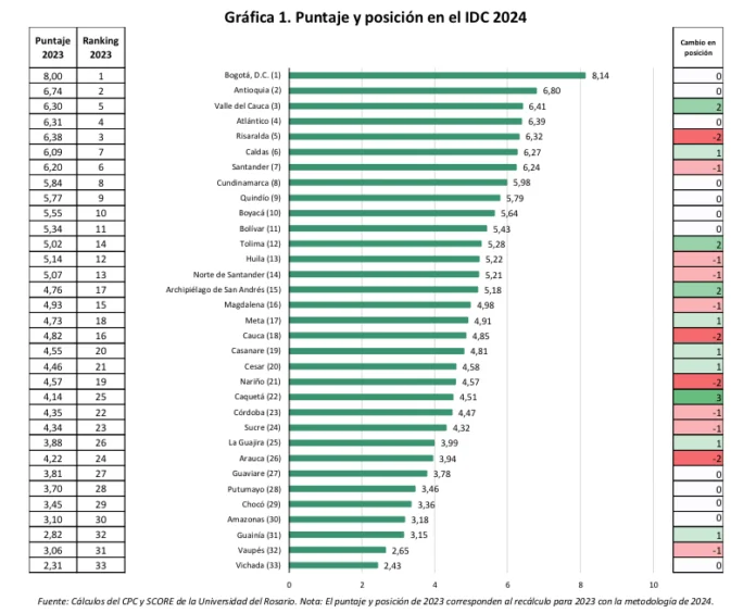 En el primer puesto del ranking se encuentra Bogotá, que lidera en 9 de los 13 pilares evaluados en el IDC 2024, obteniendo un puntaje general de 8,14 sobre 10. Le sigue Antioquia en el segundo lugar con un puntaje de 6,80 y Valle del Cauca en el tercero con 6,41, habiendo ascendido dos posiciones desde el recálculo del año anterior.