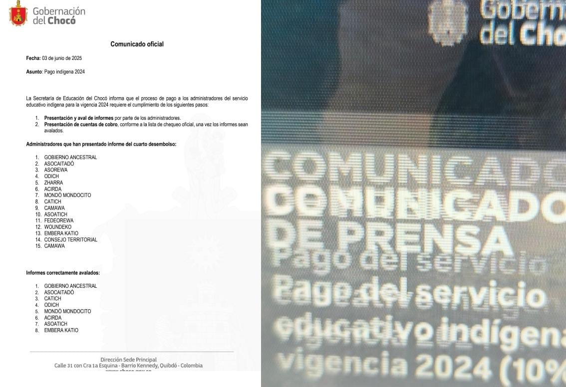 La Secretaría de Educación del Chocó anunció avances significativos en el proceso de pago a los administradores del servicio educativo indígena correspondiente a la vigencia 2024. De los 15 administradores que presentaron informes para el cuarto desembolso, 8 ya tienen sus informes correctamente avalados, lo que permite el avance en los trámites de pago según los lineamientos establecidos.