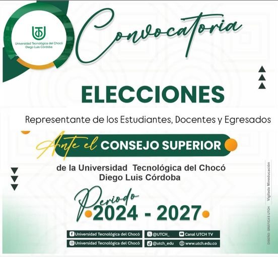 De conformidad con lo establecido en el Consejo Superior de la Universidad Tecnológica del Chocó, se informa a la comunidad universitaria y en general que, mediante el Acuerdo N. 0029, Acuerdo N. 0030 y el Acuerdo N. 0031 del 13 de noviembre del 2024, se autoriza, reglamenta y convoca las Elecciones de Representante de los Estudiantes, Egresados y Docentes ante el Consejo Superior de la Universidad Tecnológica del Chocó, periodo 2024-2027.