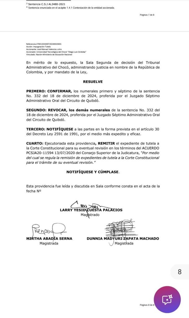 El expediente será remitido a la Corte Constitucional para su eventual revisión, en cumplimiento de los procedimientos establecidos. Mientras tanto, la comunidad académica de la UTCH espera que las autoridades competentes encuentren una solución pronta y efectiva que permita la reanudación de las actividades académicas y garantice el pago oportuno de los salarios de los docentes y trabajadores.