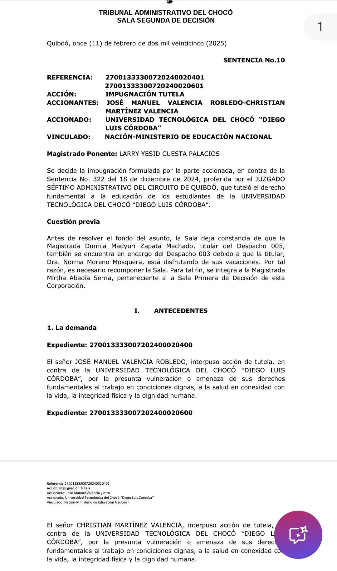 Los docentes José Manuel Valencia Robledo y Christian Martínez Valencia interpusieron una acción de tutela contra la UTCH y el Ministerio de Educación Nacional, alegando la vulneración de sus derechos fundamentales al trabajo en condiciones dignas, a la salud, la integridad física y la dignidad humana. Los demandantes argumentaron que, debido a una medida de inspección y vigilancia impuesta por el Ministerio de Educación, se habían generado retrasos en el pago de sus salarios correspondientes a octubre y noviembre de 2024, lo que afectó gravemente su situación económica y la de sus familias.