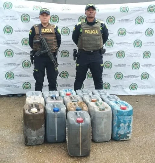 En la vía que de Nóvita conduce al corregimiento de Cajón en desarrollo de actividades de registro y control a vehículos, se realiza la incautación de 96 galones de combustible (ACPM) distribuido en 16 pimpinas, evaluados en la suma de $ 1.104.000.