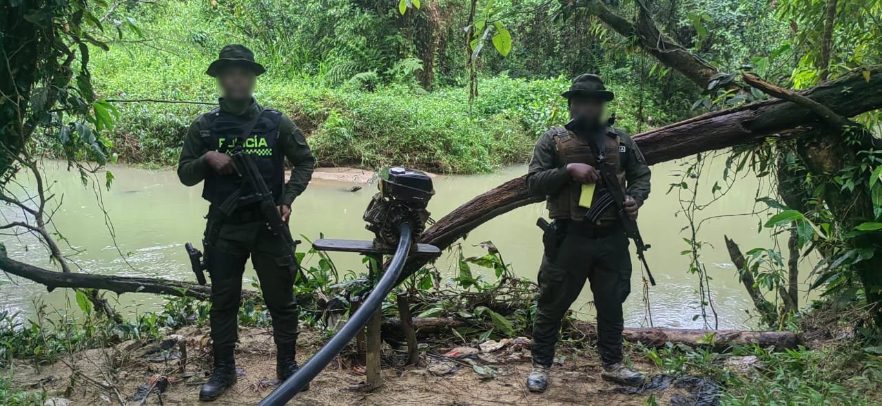 La Policía Nacional interviene minas de oro ilegales y neutraliza nueve motobombas en Quibdó.
