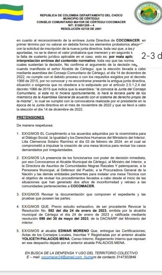 En respuesta a estas inconformidades, el comité organizador exige la creación de una mesa técnica para revisar los procedimientos y resolver las disputas en torno a la elección de la nueva junta directiva. Solicitan también la presencia de funcionarios clave, incluyendo al Alcalde de Cértegui, al Ministro del Interior, y otros representantes relevantes, para discutir las irregularidades y buscar una resolución satisfactoria.