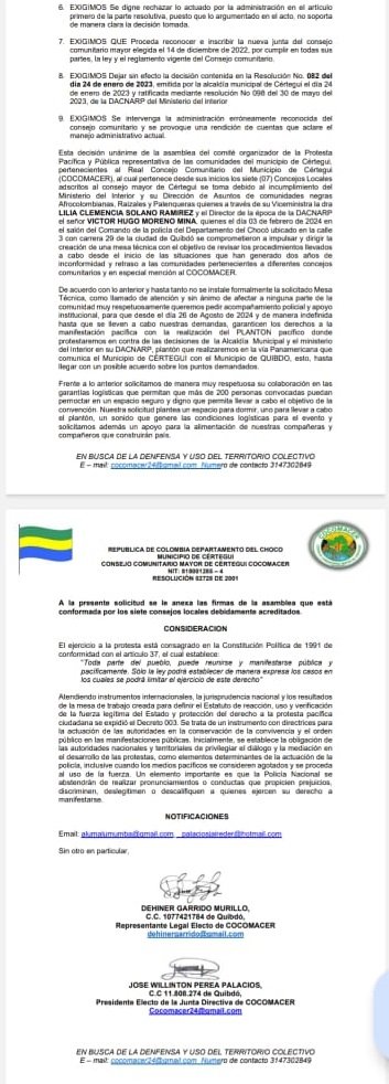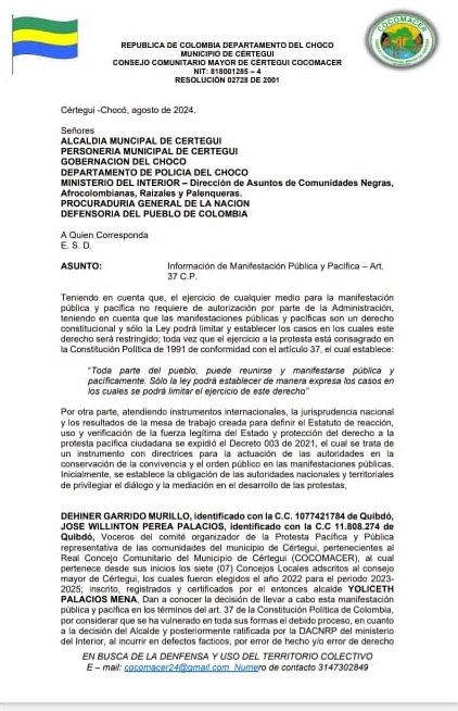 La administración municipal de Cértegui, la Personería Municipal, la Gobernación del Chocó, el Departamento de Policía del Chocó, el Ministerio del Interior – Dirección de Asuntos de Comunidades Negras, Afrocolombianas, Raizales y Palenqueras, la Procuraduría General de la Nación y la Defensoría del Pueblo de Colombia han sido notificadas sobre una próxima manifestación pública y pacífica organizada por el Consejo Comunitario Mayor de Cértegui (COCOMACER). Este acto se llevará a cabo en respuesta a las irregularidades percibidas en la reciente decisión sobre la Junta Directiva del COCOMACER, emitida por la Alcaldía Municipal de Cértegui y ratificada por la Dirección de Asuntos de Comunidades Negras, Raizales y Palenqueras del Ministerio del Interior.