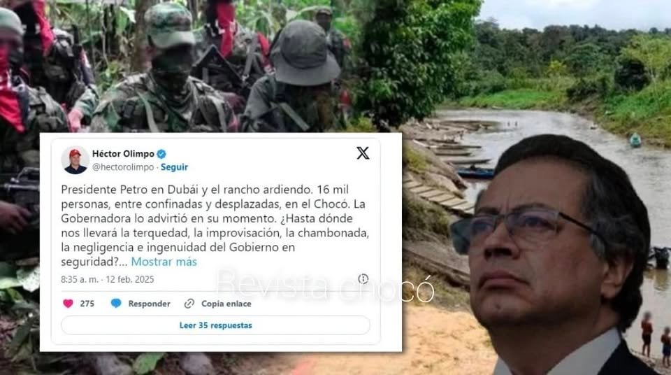 “Presidente Petro en Dubái y el rancho ardiendo. 16 mil personas entre confinadas y desplazadas en el Chocó. La Gobernadora lo advirtió en su momento. ¿Hasta dónde nos llevará la terquedad, la improvisación, la chambonada, la negligencia e ingenuidad del Gobierno en seguridad? ¿Cuántos colombianos muertos, desplazados y con miedo se necesitan para entender que la Paz Total y su política de seguridad han fracasado?”, dijo.