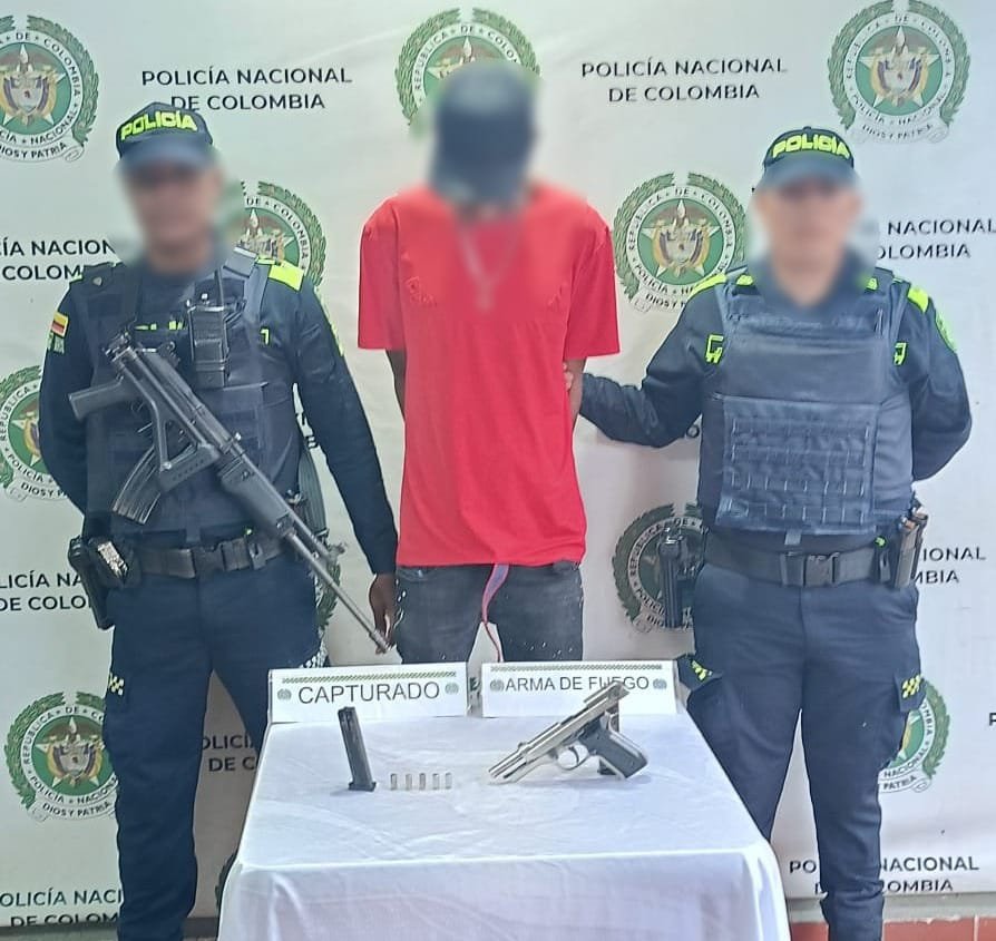 Quibdó. El 15 de septiembre de 2025, en el barrio Chambacú, gracias a labores de patrullaje y a la información suministrada por la central de radio, fue sorprendido este hombre portando una pistola traumática marca Ekol Firat Magnum-K, calibre 9 milímetros, con 5 cartuchos y un proveedor, sin ningún tipo de documento que acreditara su legalidad.