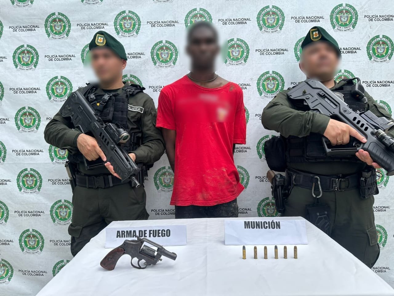Quibdó: Los hechos ocurrieron el 4 de julio del presente año, hacia las 10:50 horas, cuando el grupo GOES detectó la actitud sospechosa de una persona que, al notar la presencia policial, intentó evadir el procedimiento ingresando a una vivienda. En aplicación del artículo 158 de la Ley 1801 de 2016, se realizó el registro a persona, encontrando el arma en su poder.