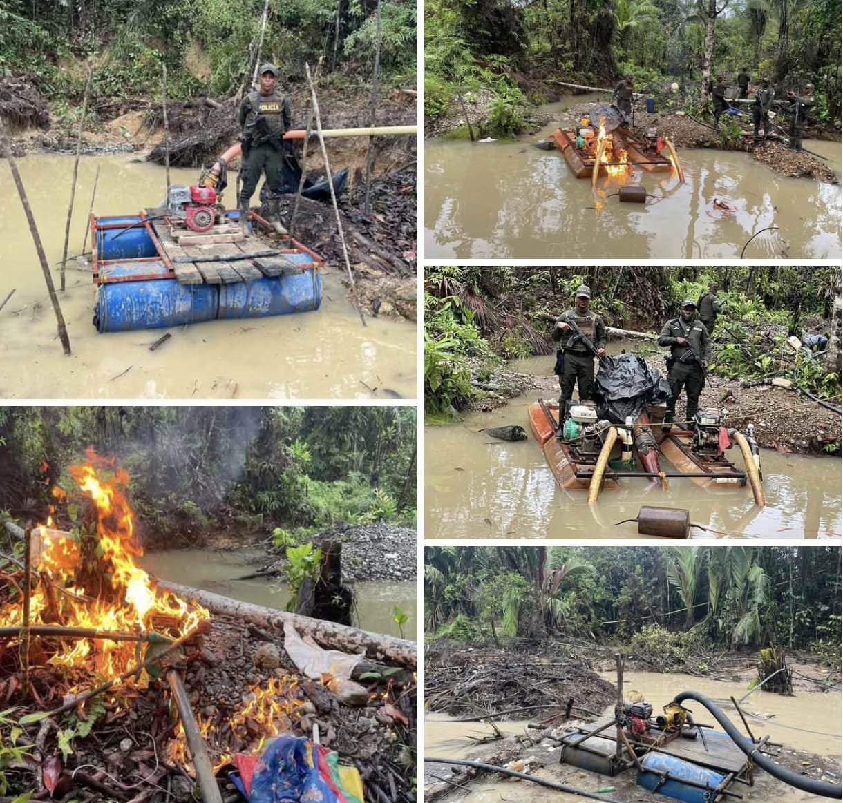 Durante la intervención realizada el 18/09/2025 fueron incautadas e inutilizadas 13 dragas de diferentes y 5 motores empleados en la explotación ilícita de yacimientos mineros, con un avalúo aproximado de 1.420 millones de pesos.
