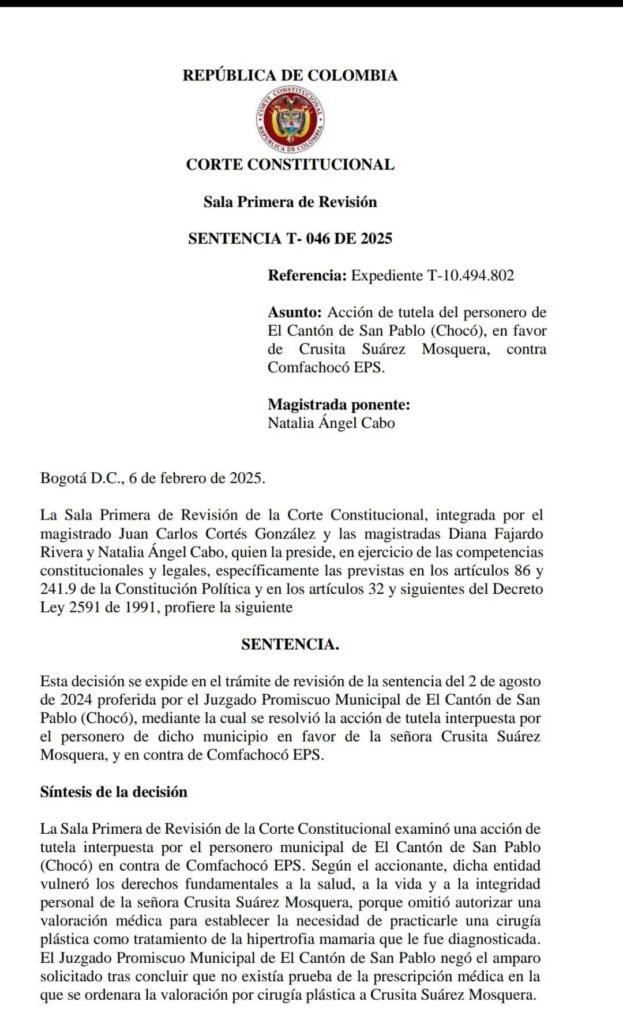 La Personería del Municipio de San Pablo logró un importante triunfo para la salud de la joven Crustita Suárez, habitante de Managru, al conseguir que la Corte Constitucional revisara y modificara un fallo de tutela de primera instancia. Gracias a esta intervención, la EPS COMFACHOCO fue ordenada a realizar una cirugía de Mamoplastia Reductora de Senos a Crustita, quien ha sufrido durante más de tres años debido a un problema que afecta su salud, particularmente su columna vertebral.