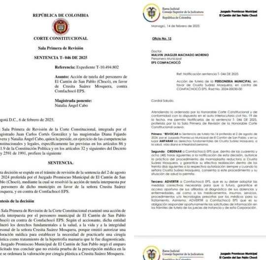 La Personería del Municipio de San Pablo logró un importante triunfo para la salud de la joven Crustita Suárez, habitante de Managru, al conseguir que la Corte Constitucional revisara y modificara un fallo de tutela de primera instancia. Gracias a esta intervención, la EPS COMFACHOCO fue ordenada a realizar una cirugía de Mamoplastia Reductora de Senos a Crustita, quien ha sufrido durante más de tres años debido a un problema que afecta su salud, particularmente su columna vertebral.