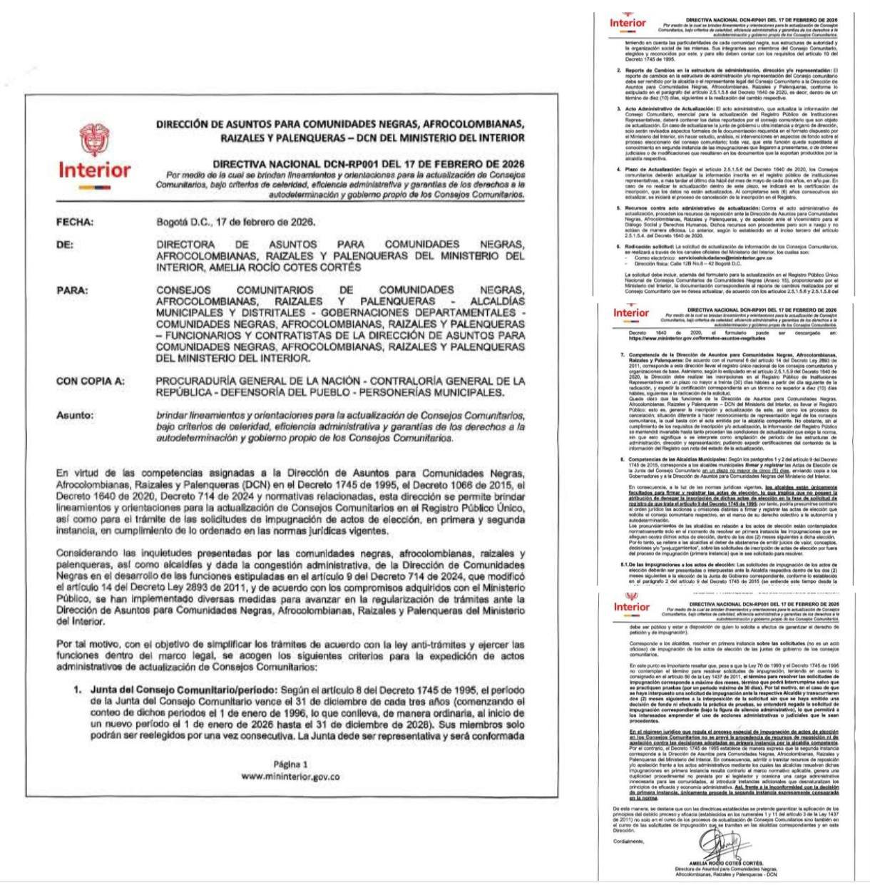 El Ministerio del Interior emitió la Directiva Nacional DCN-RP001 del 17 de febrero de 2026, mediante la cual definió orientaciones precisas para la actualización de los Consejos Comunitarios de comunidades negras, afrocolombianas, raizales y palenqueras en el Registro Público Único Nacional. La medida busca organizar los procedimientos administrativos y dar mayor seguridad jurídica a estos procesos.