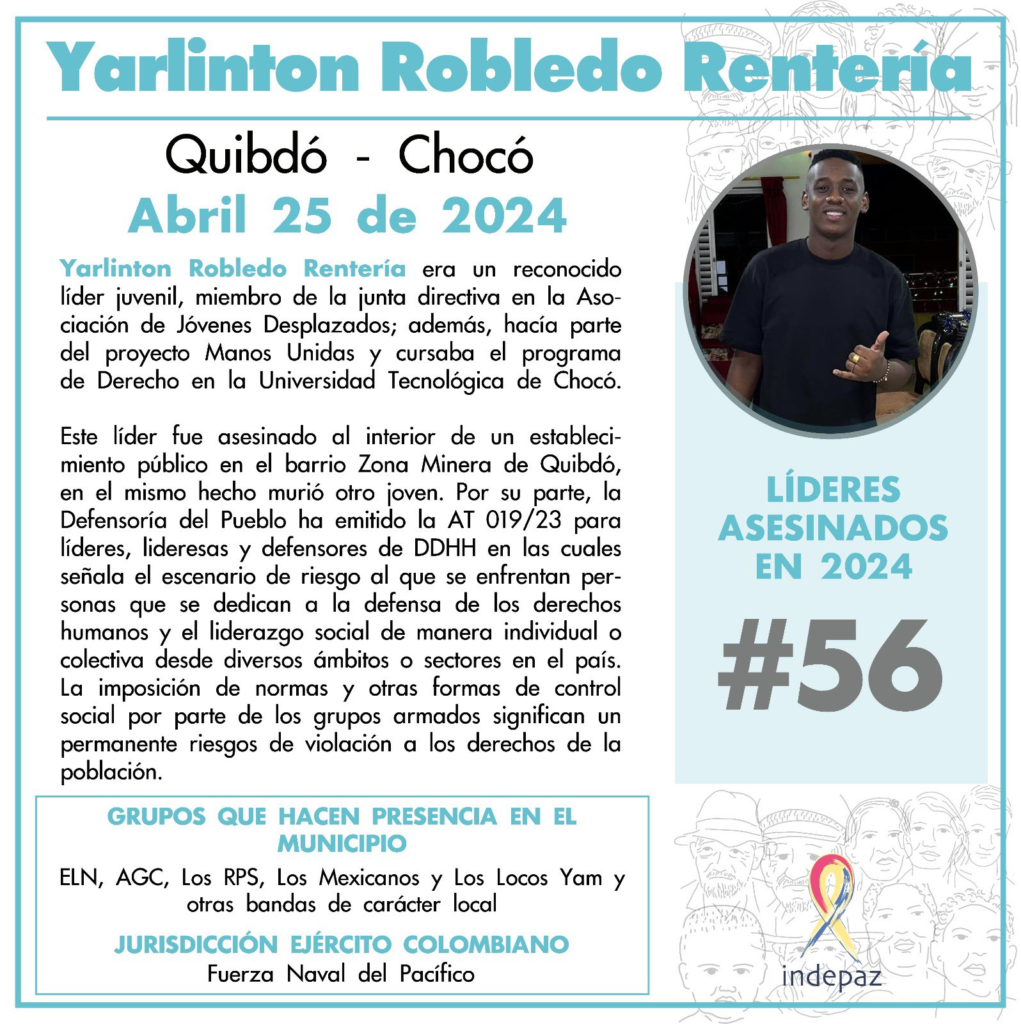 Este trágico suceso ha elevado la preocupación sobre la seguridad de los líderes sociales en Colombia. Según el Instituto de Estudios para el Desarrollo y la Paz (Indepaz), el asesinato de Yarlinton Robledo Rentería marca el trágico número 56 de líderes sociales asesinados en lo que va del año en el país. La noticia ha generado indignación y consternación en Quibdó y más allá, mientras las autoridades locales y nacionales son instadas a tomar medidas urgentes para garantizar la protección de los líderes sociales y el esclarecimiento de este crimen. La comunidad exige justicia para Yarlinton y todos aquellos que han perdido la vida defendiendo los derechos humanos y trabajando por el bienestar de sus comunidades.