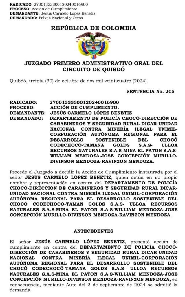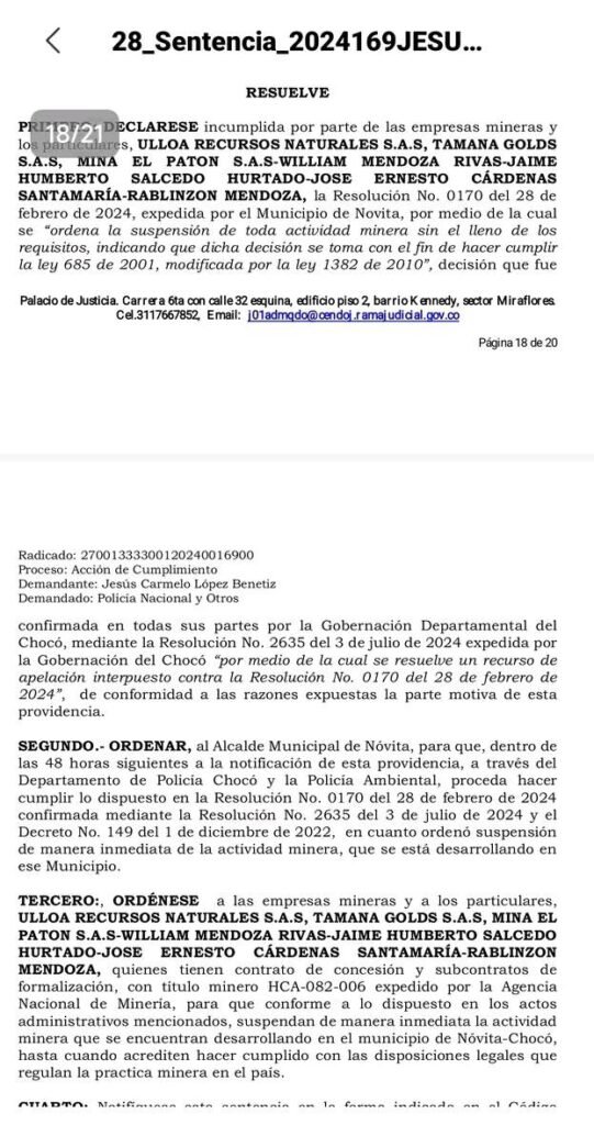 Una decisión judicial ha sacudido al municipio de Nóvita, Chocó. Mediante la sentencia de tutela 205 del 30 de octubre de 2024 y acciones de cumplimiento del 31 de marzo de 2025, el Juzgado Primero Administrativo Oral de Quibdó ordenó al alcalde Alberto Willian Rivas Asprilla suspender de inmediato toda actividad minera en el territorio. La medida fue interpuesta por el ciudadano Jesús Carmelo López, y ha generado gran preocupación entre la comunidad por su impacto social y económico.