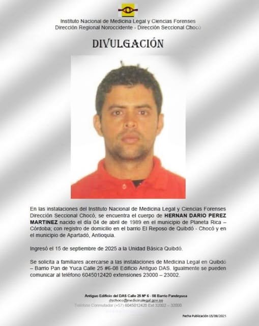Medicina Legal indicó que el proceso de identificación plena se completará una vez lleguen sus allegados a Quibdó. Por ahora, las autoridades no han entregado detalles sobre las circunstancias en que ocurrió su muerte.