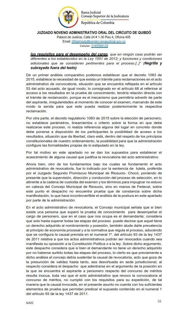 Juzgado Noveno Administrativo Oral del Circuito de Quibdó emitió la Sentencia No. 057, en la cual falló a favor de Didier Andrés Mejía Agualimpia en el caso contra el Concejo Municipal de Riosucio, Chocó.