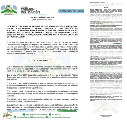La Alcaldía de Carmen del Darién emitió el Decreto 169 del 3 de diciembre de 2025, mediante el cual quedan prohibidos el uso, manipulación, fabricación, transporte, almacenamiento, venta y distribución…