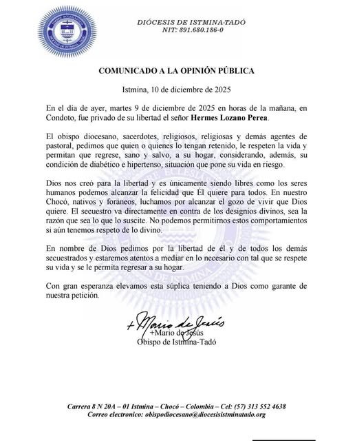 La Diócesis de Istmina-Tadó, a través de un comunicado oficial emitido el 10 de diciembre de 2025, ha manifestado su profunda preocupación y ha elevado un clamor público por la…