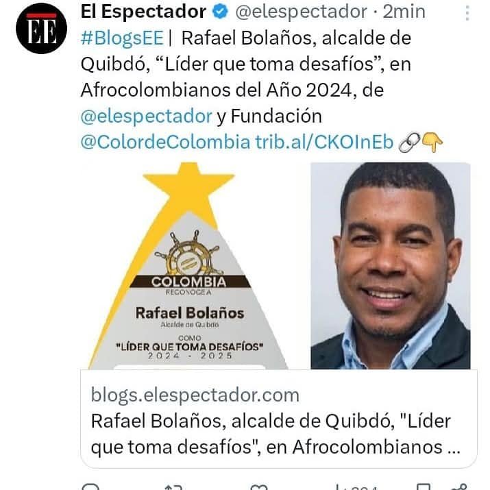 El alcalde de Quibdó, Rafael Bolaños Teddy, recibió con orgullo el reconocimiento como uno de los “Líderes que toman desafíos” en la ceremonia de premiación organizada por El Espectador y la Fundación Color de Colombia. Este premio, que se otorga anualmente desde hace 15 años, resalta el esfuerzo y dedicación de líderes que han marcado una diferencia en las comunidades afrocolombianas.