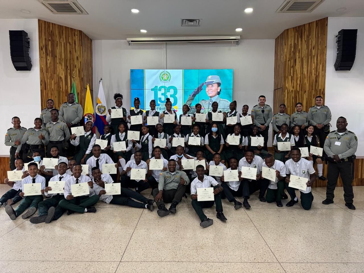 Con motivo de orgullo, el día de hoy 15/11/2024 el Grupo Protección al Turismo y Patrimonio Nacional del Departamento de Policía Chocó, lleva a cabo clausura del Grupo Juvenil Guardianes del Turismo y Patrimonio Nacional, conformado por 48 jóvenes de la Institución Educativa Normal Superior de Quibdó, quienes durante el período comprendido entre el 20/03/2024 al 08/11/2024 con una intensidad horaria de 80 horas teórico-Prácticas, lograron aprobar satisfactoriamente el servicio social estudiantil dentro del programa.