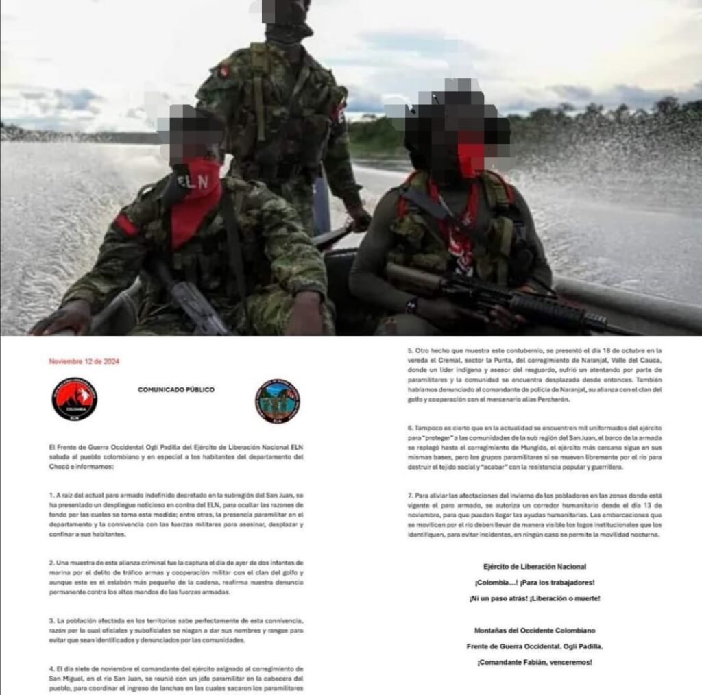El Frente de Guerra Occidental Ogli Padilla del Ejército de Liberación Nacional (ELN) emitió un comunicado dirigido al pueblo colombiano, en especial a los habitantes del Chocó, en el cual informan sobre la implementación de un corredor humanitario a partir del 13 de noviembre, en medio de un paro armado indefinido en la subregión del San Juan.