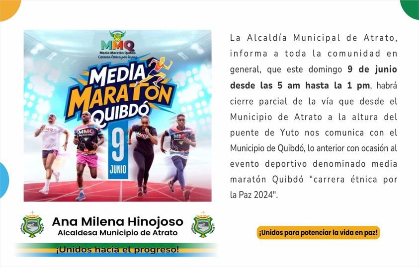 La Alcaldía Municipal de Atrato hace un llamado a todos los ciudadanos para informar sobre un cierre parcial de la vía debido a la celebración de la Media Maratón de Quibdó. Se solicita a los residentes y visitantes que planifiquen sus desplazamientos teniendo en cuenta esta medida.