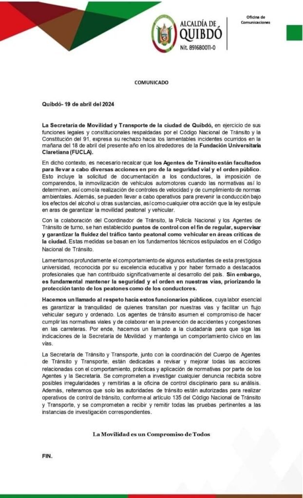 En respuesta a los lamentables incidentes ocurridos el pasado 18 de abril en los alrededores de la Fundación Universitaria Claretiana (FUCLA), la Secretaría de Movilidad y Transporte de la ciudad de Quibdó ha emitido un comunicado expresando su rechazo hacia estos sucesos.