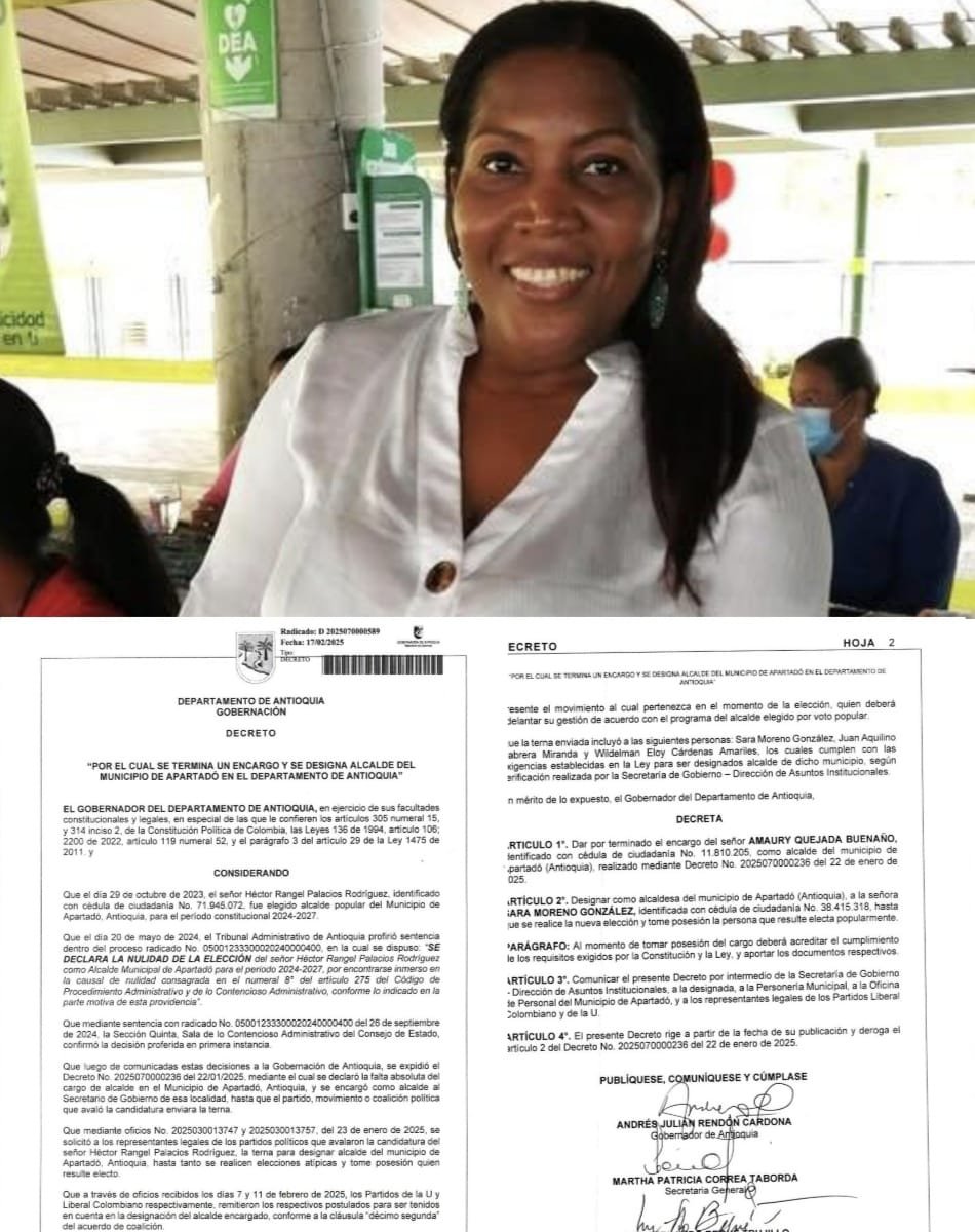 En una decisión reciente, el Gobernador del Departamento de Antioquia, Andrés Julián Rendón Cardona, expidió un decreto mediante el cual se termina el encargo de Amaury Quejada Buenaño como alcalde del municipio de Apartadó, y se designa a Sara Moreno González como alcaldesa encargada de la localidad. La nueva encargada, oriunda de Riosucio, Chocó, asumirá la responsabilidad de liderar el municipio de Apartadó hasta que se realicen nuevas elecciones y el alcalde electo tome posesión.
