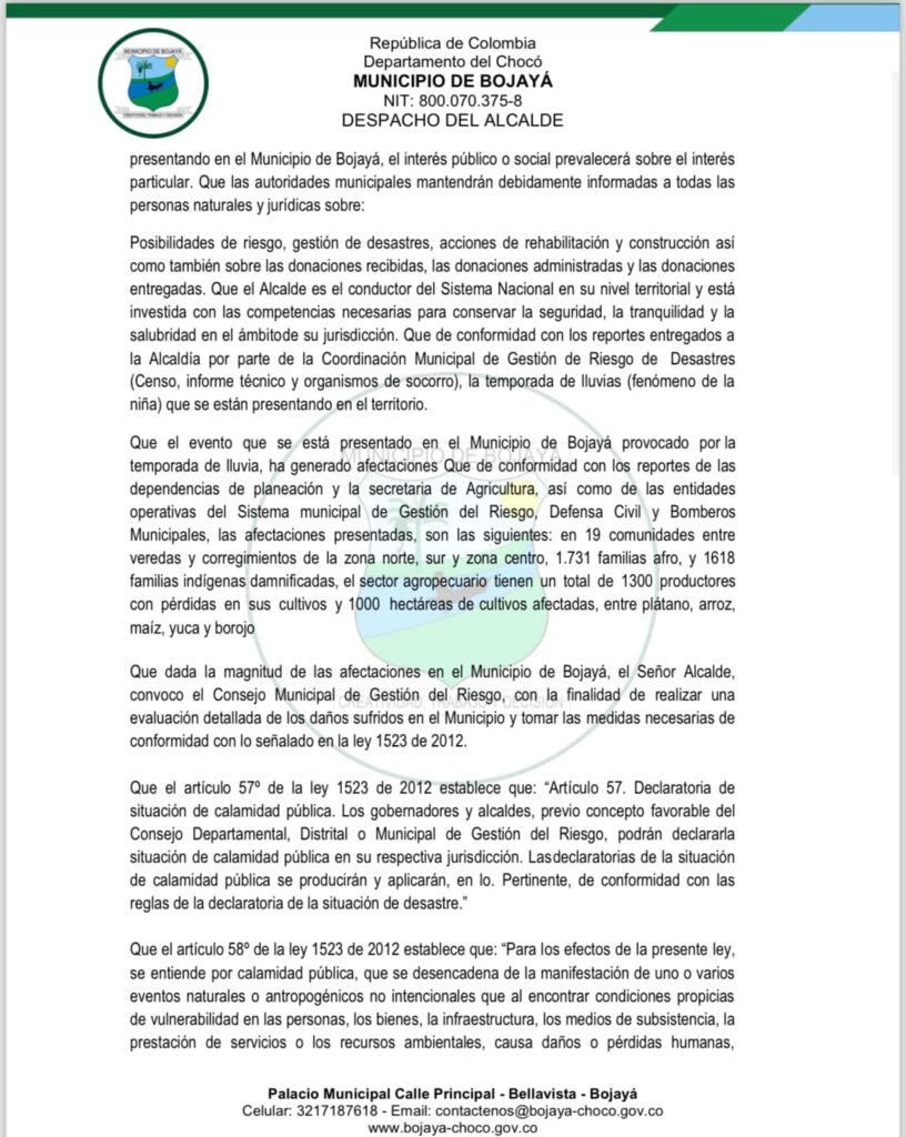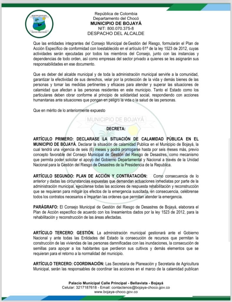 Esta declaración de calamidad pública es un paso fundamental para garantizar una respuesta integral y efectiva a la crisis que enfrenta Bojayá, y para avanzar hacia la construcción de un futuro más seguro, digno y próspero para todos sus habitantes.