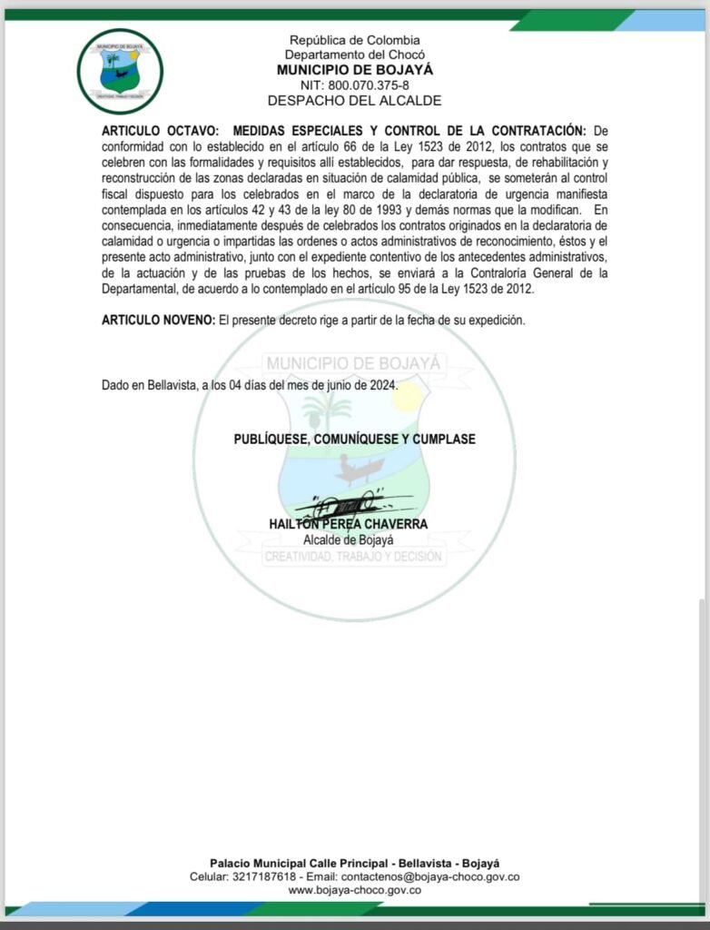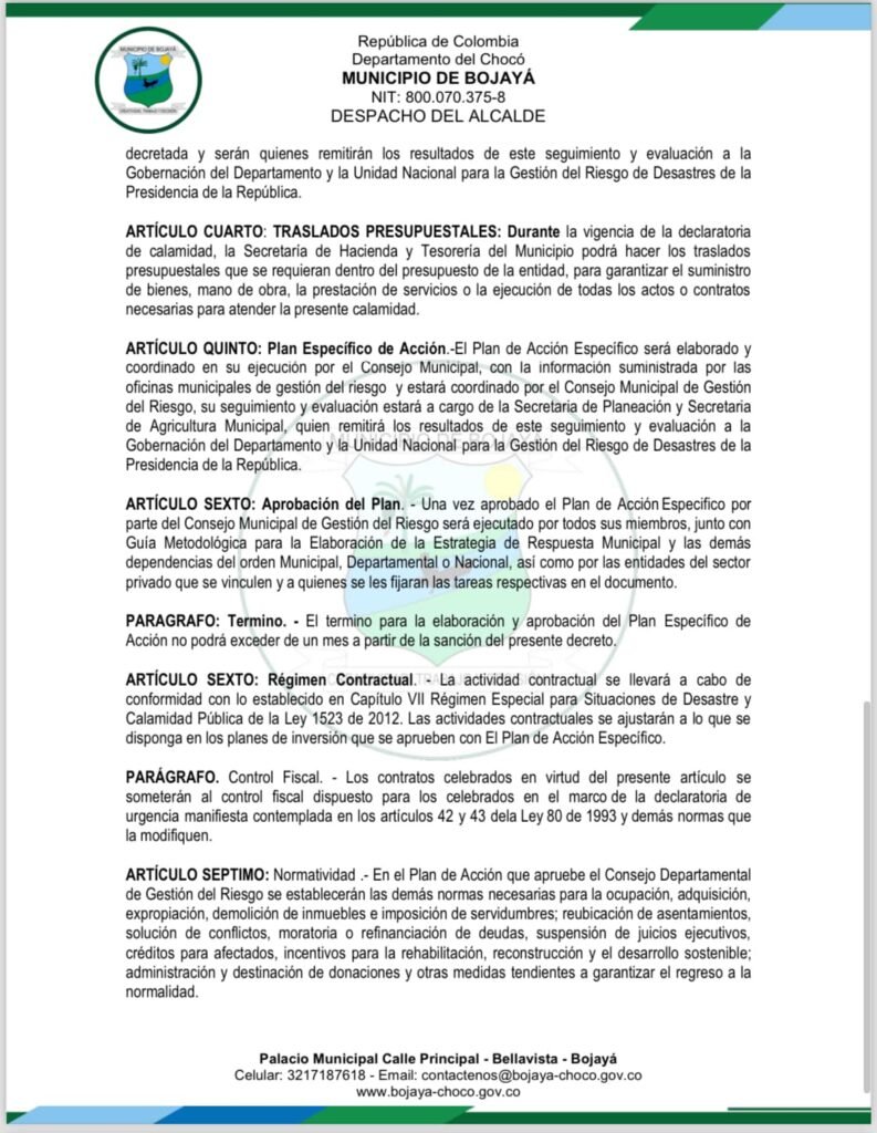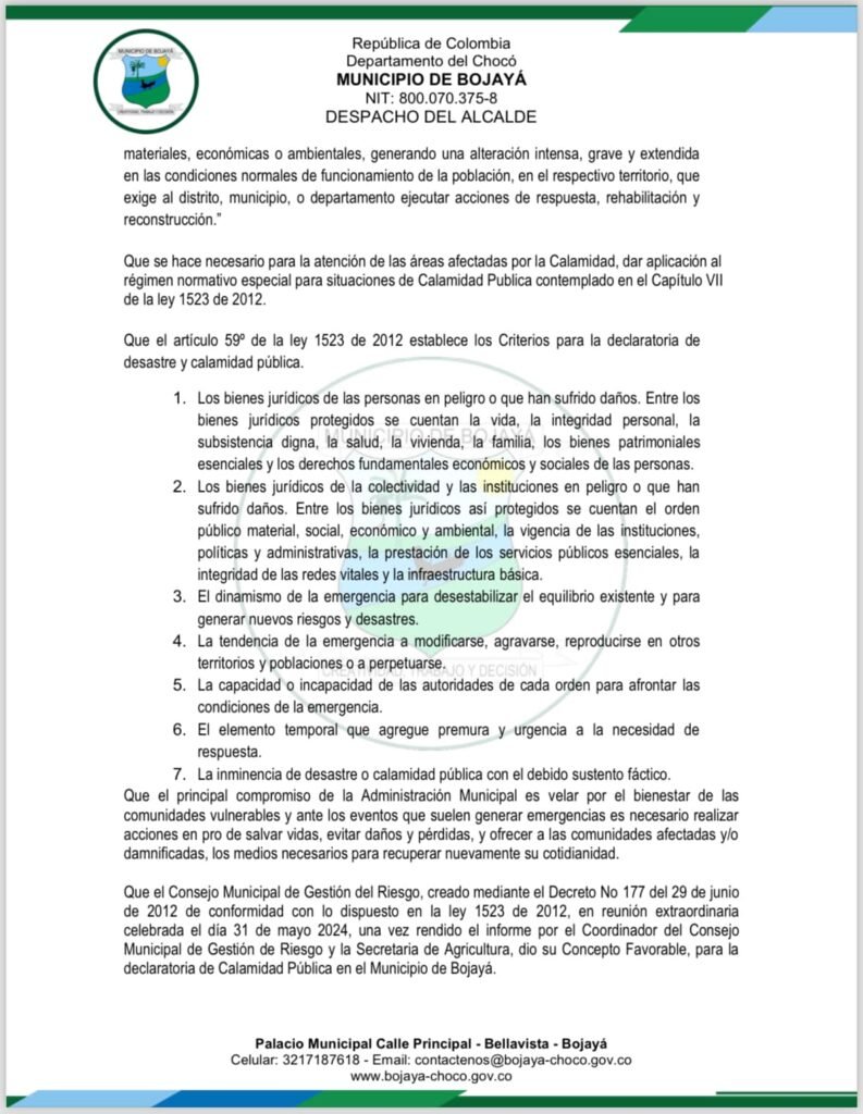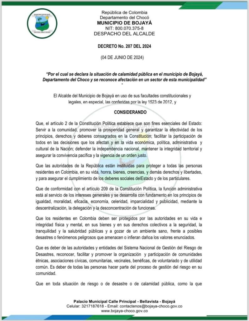 El Gobierno Nacional, en atención a la grave situación que enfrenta el municipio de Bojayá, ubicado en el Departamento del Chocó, ha emitido el Decreto No. 207 del 2024, mediante el cual se declara la situación de calamidad pública en esta localidad.