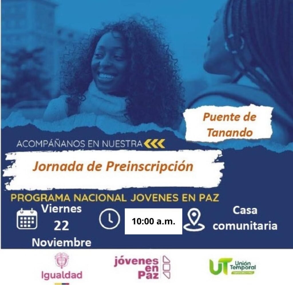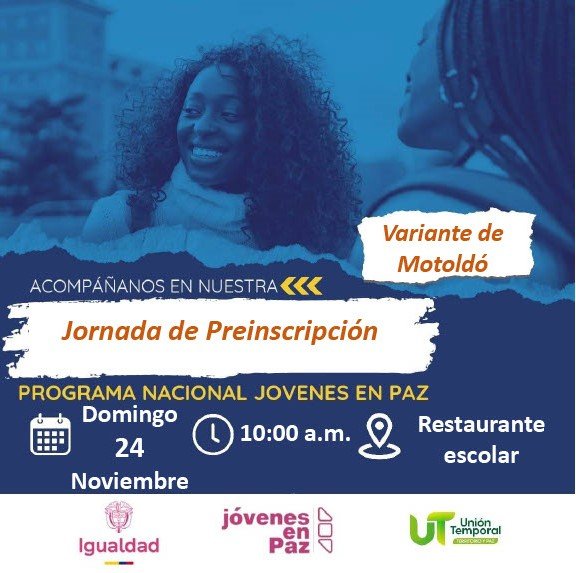 La Alcaldía de Atrato, liderada por la alcaldesa Ana Milena Hinojoso, anuncia el inicio de las preinscripciones para el programa “Jóvenes en Paz”, dirigido a jóvenes entre los 14 y 28 años de los corregimientos de La Molana, Variante de Motoldó, Puente de Tanando, Motoldo, Yuto y la cabecera municipal de Atrato.