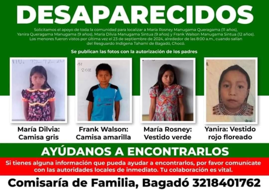 La alcaldía de Bagadó ha solicitado la colaboración de la comunidad para localizar a los menores: María Rosney Manugama Queragama (11 años), Yanira Queragama Manugama (9 años), María Dilvia Manugama Sintua (9 años) y Frank Walson Manugama Sintua (12 años). Según el gobierno local, fueron vistos por última vez el 23 de septiembre de 2024, a las 8:00 a.m., al salir del Resguardo Indígena Tahamí en Chocó.