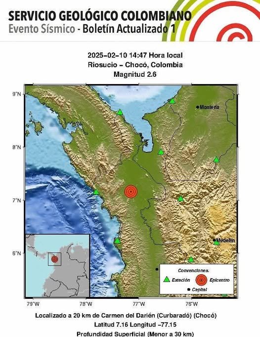 Un temblor de magnitud 2.6 en la escala de Richter fue registrado en el municipio de Riosucio, Chocó, a las 2:47 p.m., según el Servicio Geológico Colombiano. El epicentro del movimiento sísmico se localizó a 20 km de Carmen del Darién (Curbaradó), con una profundidad superficial menor a 30 km, lo que provocó alarma entre los habitantes de la región. A pesar de la intensidad moderada, no se han reportado daños materiales ni personas heridas hasta el momento.