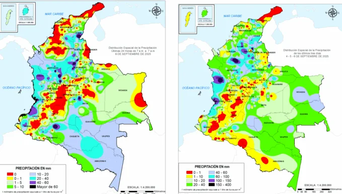 Ahora, en cuanto a las lluvias y precipitaciones, con una recaudación de datos que va entre el 6 y el 7 de septiembre el Instituto de Hidrología, Meteorología y Estudios Ambientales mencionó que se dio una reducción del 13 % en los volúmenes de precipitación con respecto al día anterior.