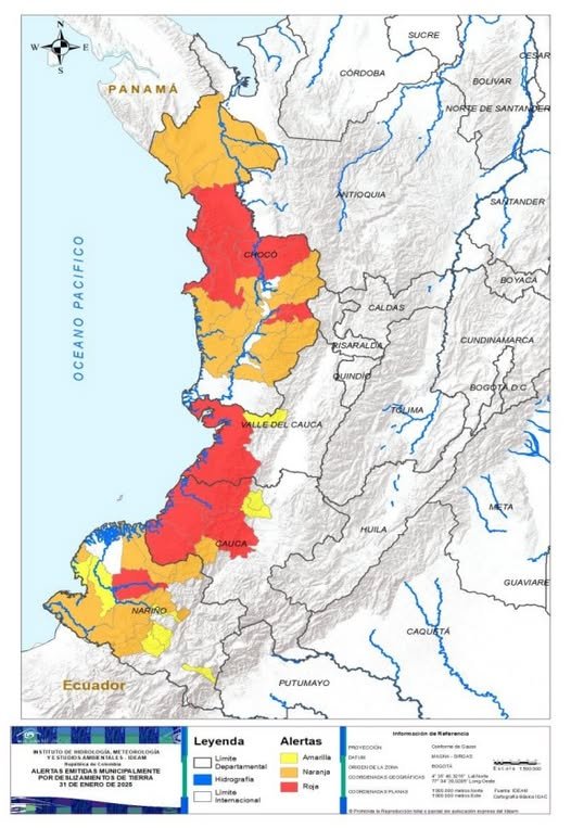 Debido a las fuertes precipitaciones de los últimos días, el departamento del Chocó enfrenta una grave situación de saturación de humedad en los suelos. Esta condición ha generado una alerta roja y naranja en 25 municipios, con un riesgo elevado de deslizamientos de tierra en zonas de ladera y alta pendiente. Los municipios más afectados con alerta roja incluyen Alto Baudó, Bahía Solano, Bojayá, Nuquí y Quibdó, entre otros. Mientras tanto, otros 17 municipios se encuentran en alerta naranja, como Bagadó, Istmina y Lloró, con altas probabilidades de desastres naturales si las lluvias continúan.