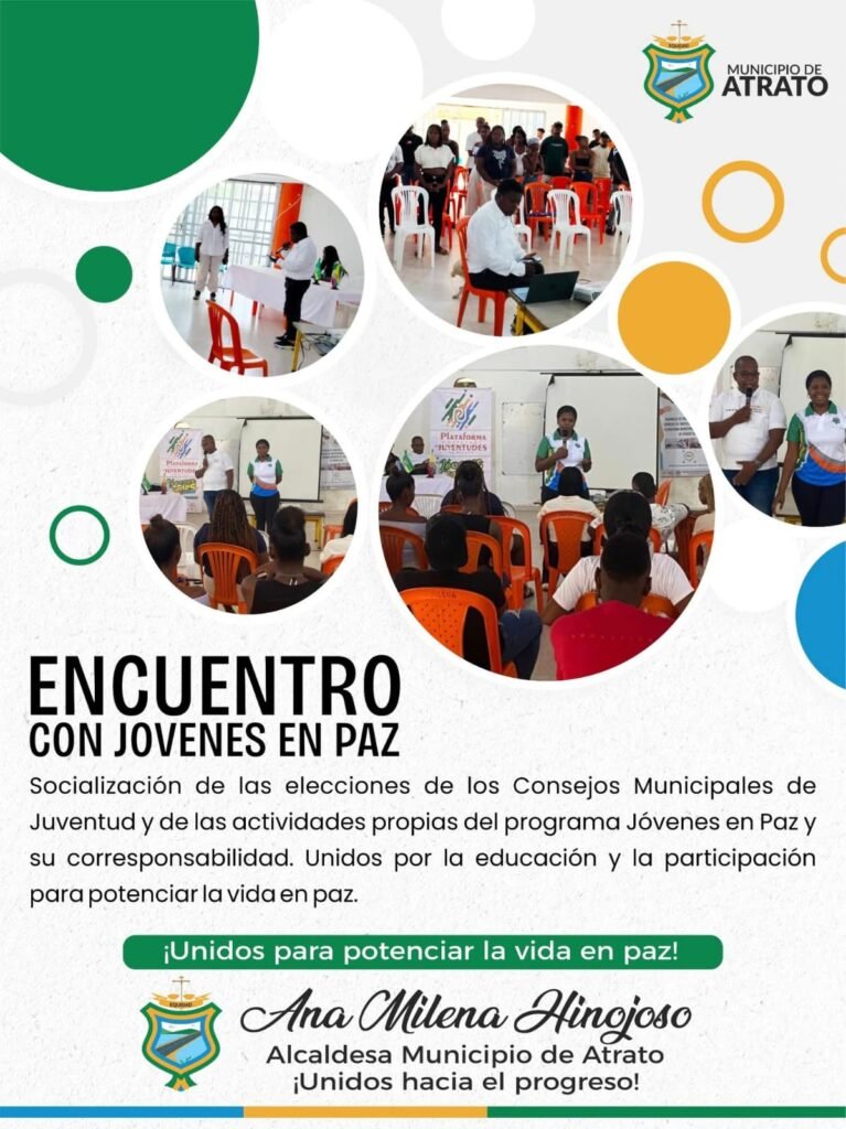 La Alcaldía Municipal de Atrato llevó a cabo la socialización de las elecciones de los Consejos Municipales de Juventud (CMJ) y las actividades del programa Jóvenes en Paz. El evento resaltó la importancia de la corresponsabilidad, la educación y la participación activa de la juventud atrateña en la construcción de un futuro en paz para el municipio.