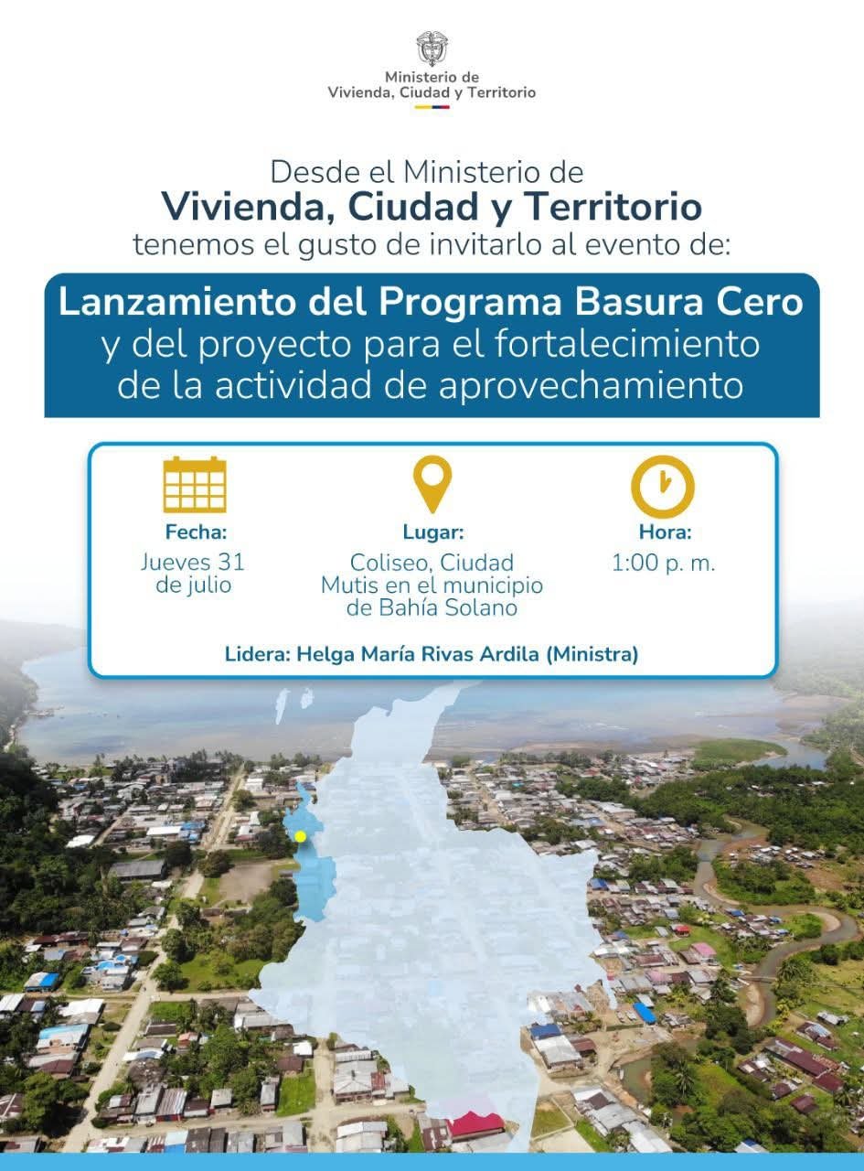 La Alcaldía Municipal de Bahía Solano se complace en anunciar el lanzamiento oficial del programa Basuras Cero, una iniciativa ambiciosa que busca transformar el municipio en un entorno más limpio, saludable y sostenible. El evento contará con la presencia especial de la Ministra de Ambiente, Helga María Rivas Abadía, quien respaldará este importante paso hacia un Bahía Solano comprometido con el medio ambiente.