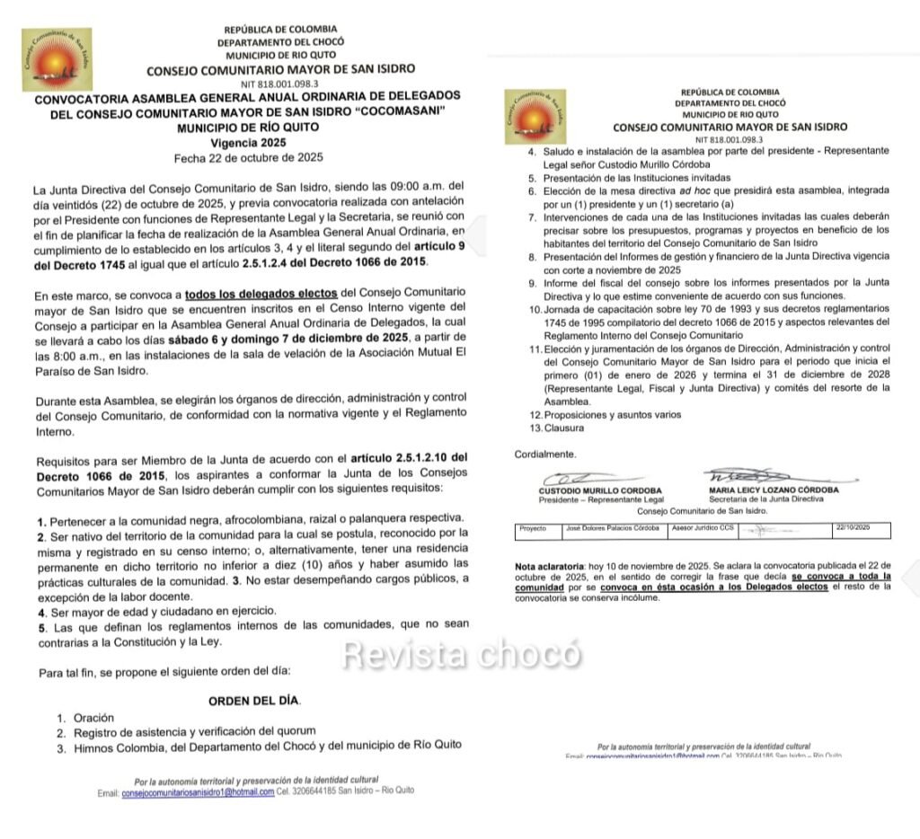 El Consejo Comunitario Mayor de San Isidro (COCOMASANI) del municipio de Río Quito, Chocó, ha anunciado la realización de su Asamblea General Anual Ordinaria de Delegados los días 6 y 7 de diciembre de 2025, a partir de las 8:00 a.m., en las instalaciones de la Asociación Mutual El Paraíso de San Isidro. Este encuentro será un espacio clave para la participación democrática y el fortalecimiento del liderazgo afrodescendiente en el territorio.