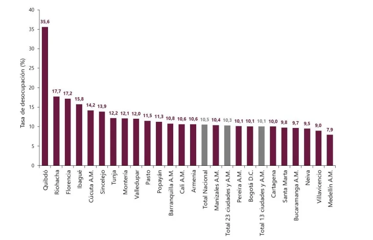 Sin embargo, a pesar del panorama alentador en general, Quibdó continúa liderando el ranking de las ciudades con mayor desempleo, alcanzando una alarmante tasa del 35.6%. Le siguen Riohacha (17.7%), Florencia (17.2%), Ibagué (15.8%) y Cúcuta (14.2%), lo que demuestra la persistente desigualdad territorial en materia de empleo, especialmente en regiones históricamente marginadas.