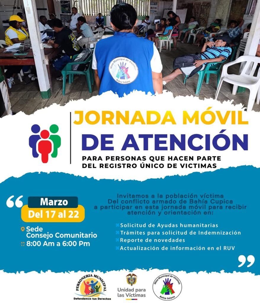 De conformidad a las gestiones realizadas por la Mesa Municipal de Víctimas del Municipio y su Secretaria Técnica en cabeza del Personero Municipal, se realizó en el Corregimiento de Bahia Cupica, una jornada de atención móvil por parte de la Unidad para la Atención y Reparación Integral a las Víctimas.