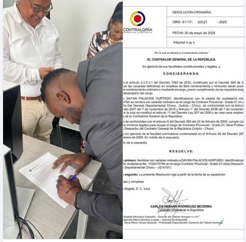 Con la Resolución 03121 del 30 de mayo de 2025, la Contraloría General de la República designó al abogado chocoano Dayan Palacios Hurtado como nuevo Contralor Provincial para el departamento del Chocó. La posesión del cargo se llevó a cabo este lunes en la ciudad de Bogotá, marcando un nuevo capítulo en la carrera de este joven profesional que, con tan solo 29 años, ha demostrado liderazgo, compromiso y preparación.