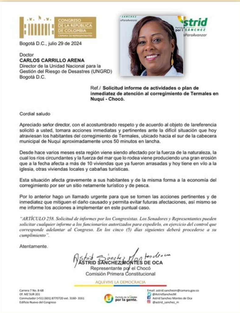 La representante a la Cámara por Chocó, Astrid Sánchez, ha dado un paso crucial al solicitar formalmente a la Unidad Nacional para la Gestión del Riesgo de Desastres que atienda con urgencia la difícil situación que atraviesa el corregimiento de Termales en Nuquí. Sánchez destacó la gravedad de la emergencia, subrayando que las condiciones actuales en la zona requieren una respuesta inmediata para evitar mayores consecuencias.