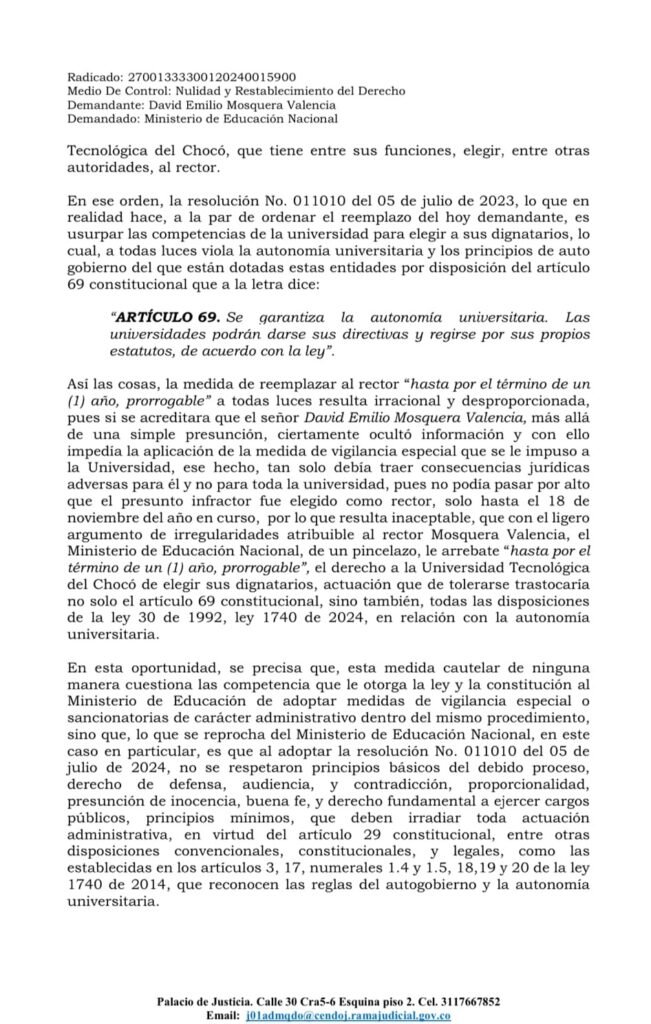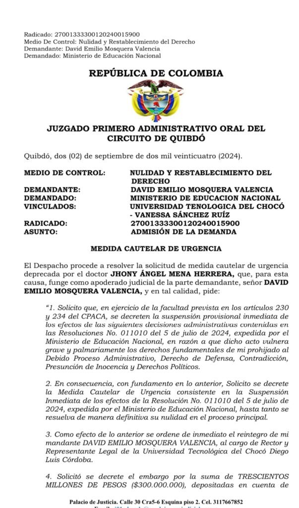 En providencia del 2 de septiembre de 2024 y ante la medida cautelar interpuesta por el abogado Jhony Ángel Mena Herrera, abogado de David Emilio Mosquera Valencia, por lo que el despacho procedió a resolver la solicitud de medida cautelar de urgencia para esta causa, disponiendo lo siguiente: