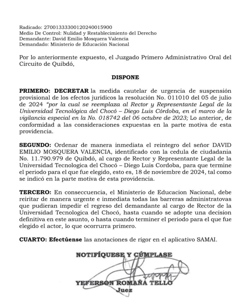 SEGUNDO: Ordenar de manera inmediata el reintegro del señor DAVID EMILIO MOSQUERA VALENCIA, identificado con la cedula de ciudadanía No. 11.790.979 de Quibdó, al cargo de Rector y Representante Legal de la Universidad Tecnológica del Chocó – Diego Luis Córdoba, para que termine el periodo para el que fue elegido, esto es, 18 de noviembre de 2024, tal como se indicó en la parte motiva de esta providencia.
